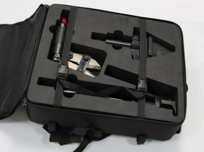 背負式電動液壓工具組以電動泵為動力,重量輕,作用力大,效率高。單手操作模式,實現(xiàn)在狹小空間里更加靈活的使用工具;電動液壓泵具有二級壓力輸出,根據外接負載的變換自動轉變壓力;電動液壓泵作為液壓動力源與組件中其他工具配套進行破拆作業(yè);撬棍可單獨進行起釘及撬拆工作;邊緣抬升器底腳與油缸的螺旋槽可以增大開門距離,需要時可擰出;邊緣抬升器的分離槽有防滑功能,可分離易打滑的框架結構;微型剪切器尺寸小、重量輕,剪切力大,能剪斷直徑18mm的圓鋼;套組工具接口均為單管平接口,平面密封,具備鎖止功能和防塵裝置;套組采用線控方式操作,超大控制按鈕,操控方便、簡單;具有定位功能,更適合精確操作。