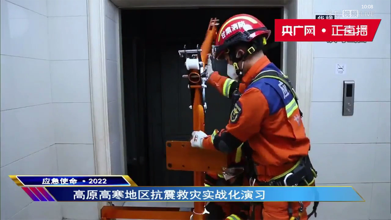 演習模擬甘肅省張掖市甘州區發生7.5級地震,大量房屋倒塌人員埋壓被困于商場電梯井中。平涼消防救援支隊利用蘭州德利泰電子電氣有限公司的多功能救援支架構設繩索救生系統,起吊生的希望。